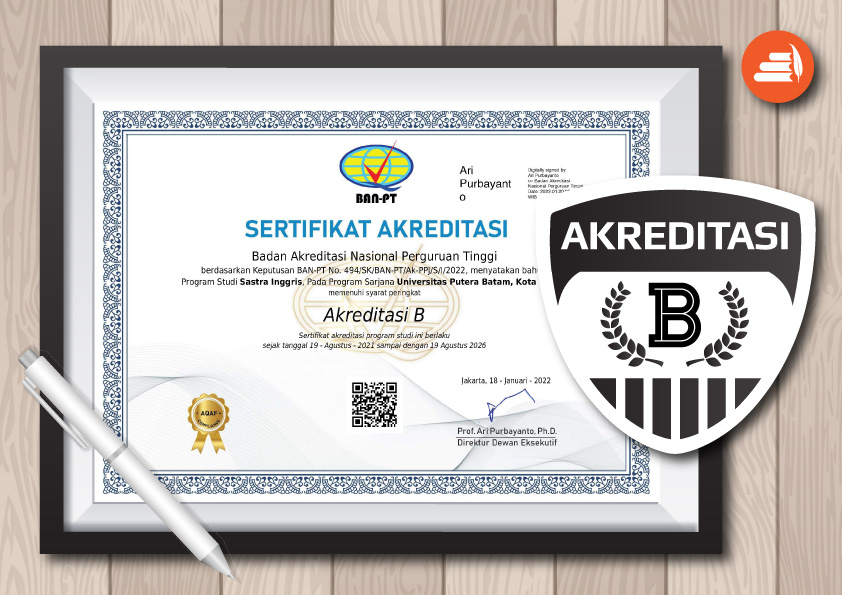 Program Studi Sastra Inggris Putera Batam telah terakreditasi sesuai "B" dengan Keputusan Badan Akreditas Nasional Perguruan Tinggi Nomor 494/SK/BAN-PT/Ak-PPJ/S/I/2022