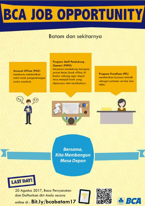 Diinformasikan bahwa BCA membuka lowongan kerja bagi teman-teman mahasiswa di UPB. Lowongan ini kami buka, dan menggunakan pendaftaran secara online di : bit.ly/bcabatam17 Lowongan kerja terbatas dan dapat ditutup sewaktu-waktu saat kuota pelamar tercukupi. |