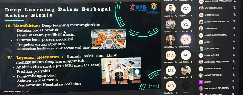 Batam, 9 November 2024, Universitas Putera Batam (UPB) melalui Program Studi S-1 Sistem Informasi Mengadakan Webinar Nasional kepada mahasiswa/I dengan Tema “Revolusi Bisnis Dengan Deep Learning : Mengoptimalkan Proses dan Keputusan”. Acara tersebut dihadiri sekitar 350an lebih mahasiswa/i dan juga dihadiri oleh Ketua Program Studi S-1 Sistem Informasi yaitu Bapak Muhammat Rasid Ridho, S.Kom., M.SI, dan beberapa orang Dosen S-1 Sistem Informasi yaitu Erlin Elisa, S.Kom., M.Kom., Saut Pintubipar Saragih, S. Kom., M.MSI., dan Darmansah, S.Kom., M.Kom. Dalam kesempatan tersebut hadir juga Ketua Program Studi Sistem Informasi yaitu Bapak Muhammat Rasid Ridho, S.Kom., M.SI. dalam sambutannya, Bapak Rasid mengatakan “Tema ini sangat penting di era industry hari ini, di mana perkembangan teknologi, khususnya kecerdasan buatan dan deep learning, membawa perubahan besar bagi dunia bisnis. Deep learning telah membuka pintu bagi inovasi yang berpotensi besar untuk mengoptimalkan berbagai proses bisnis, mempercepat pengambilan keputusan, dan meningkatkan daya saing organisasi. Penggunaan teknologi ini semakin terasa manfaatnya di berbagai sektor, mulai dari keuangan, kesehatan, manufaktur, hingga pemasaran, yang semuanya merasakan perubahan signifikan dalam cara kerja mereka.”. selain itu ia juga berharap bahwa “melalui kuliah umum ini, kita semua dapat memperoleh wawasan baru, inspirasi, dan mungkin juga keberanian untuk mengambil langkah-langkah berani dalam memanfaatkan teknologi deep learning dalam bisnis dan pekerjaan kita masing-masing. Semoga acara ini bermanfaat dan memberikan dampak positif bagi kita semua”. Pada kesempatan ini hadir Narasumber yaitu Prof.. Dr. Abd. Samad Bin Hasan Basari., Beliau adalah dosen Universiti Teknikal Malaysia Melaka, Kemudian Sasa Ani Arnomo, S.Kom., M.SI., Ph.D, Beliau adalah Universitas Putera Batam dan Rahmaddeni, S.Kom., M.Kom, S.Kom, beliau adalah Dosen STMIK Amik Riau. Dalam materi yang di paparkan oleh Bapak Prof.. Dr. Abd. Samad Bin Hasan Basari pada webinar tersebut yaitu tentang “Revolusi Bisnis Dengan Deep Learning : Mengoptimalkan Proses dan Keputusan”. Serta beberapa sub topik tentang Deep Learning. Menurut Prof. Samad dalam pemaparannya, “Deep learning adalah salah satu cabang dari machine learning yang berfokus pada penggunaan jaringan saraf tiruan (artificial neural networks) dengan banyak lapisan (layers) untuk mempelajari dan mengekstrak pola dari data yang kompleks. Deep learning merupakan bagian dari bidang yang lebih luas, yaitu kecerdasan buatan (AI), di mana tujuan utamanya adalah membuat sistem yang mampu belajar dari data dan membuat keputusan yang cerdas. Dengan lapisan-lapisan yang dalam dan kemampuan untuk mempelajari representasi data secara hierarkis, deep learning telah membuka peluang baru dalam berbagai industri dan mempercepat inovasi di bidang kecerdasan buatan. Kemudian deep learning juga memiliki beberapa model yang popular yaitu yang terdiri dari Multilayer Perceptron (MLP), Convolutional Neural Networks (CNN), Recurrent Neural Networks (RNN), Generative Adversarial Networks (GAN) dan Deep Belief Networks (DBN)”. Kemudian Materi yang di paparkan oleh Bapak Sasa Ani Arnomo, S.Kom., M.SI., Ph.D yaitu berfokus kepada “Deep Learning Chatbots” Beliau mengatakan dalam pemaparannya yaitu “Deep Learning Chatbots adalah program komputer yang dirancang untuk mensimulasikan percakapan manusia. Dibandingkan dengan chatbot konvensional yang menggunakan aturan sederhana atau basis data kata kunci, Deep Learning chatbot memanfaatkan kekuatan Deep Learning untuk lebih memahami bahasa alami. Dengan kemampuan ini, Deep Learning Chatbots telah menjadi alat yang sangat berguna dalam berbagai industri, termasuk e-commerce, layanan kesehatan, pendidikan, dan keuangan.”. Sedangkan materi yang dipaparkan oleh Bapak Rahmaddeni, S.Kom., M.Kom, S.Kom yaitu berfokus kepada “Dampak Revolusi Bisnis Menggunakan Deep Learning Bagi Sebuah Prusahaan”. Beliau menjelaskan “ Revolusi bisnis menggunakan deep learning memberikan dampak besar bagi perusahaan, baik dalam aspek operasional, strategis, maupun kompetitif. Deep learning memungkinkan otomatisasi pada berbagai proses bisnis, seperti pemrosesan data, pengenalan pola, dan analisis prediktif. Hal ini mengurangi kebutuhan akan intervensi manual dan mempercepat proses operasional, sehingga perusahaan dapat bekerja lebih efisien dan menghemat biaya. Contohnya, dalam industri manufaktur, deep learning dapat digunakan untuk memantau kualitas produk secara otomatis dan mendeteksi kerusakan pada tahap awal. Kemudian Teknologi deep learning memungkinkan perusahaan menganalisis data dalam jumlah besar dan memahami pola-pola tersembunyi yang sebelumnya sulit dideteksi. Ini membantu pengambilan keputusan yang lebih akurat berdasarkan data dan prediksi yang kuat. Misalnya, perusahaan ritel dapat memprediksi perilaku pelanggan secara lebih tepat, sehingga dapat merancang strategi pemasaran yang lebih efektif dan tepat sasaran”. Adapun Kesimpulan yang bisa di Tarik pada kegiatan ini adalah Perkembangan teknologi deep learning telah menghadirkan revolusi dalam dunia bisnis, memberikan peluang besar bagi perusahaan untuk mengoptimalkan proses dan pengambilan keputusan. Teknologi ini memungkinkan analisis data dalam jumlah yang sangat besar, mengekstrak pola dan wawasan yang tidak terdeteksi oleh metode konvensional, serta memberikan prediksi yang lebih akurat. Dengan implementasi deep learning, berbagai sektor bisnis kini dapat meningkatkan efisiensi operasional melalui otomatisasi proses, personalisasi layanan, prediksi permintaan, serta deteksi risiko secara real-time. Hal ini membawa dampak signifikan bagi berbagai industri seperti keuangan, kesehatan, ritel, dan manufaktur, yang kini mampu memberikan respons lebih cepat dan adaptif terhadap perubahan pasar. Namun, adopsi teknologi ini juga memerlukan persiapan yang matang, termasuk infrastruktur data yang kuat, keahlian khusus, sert