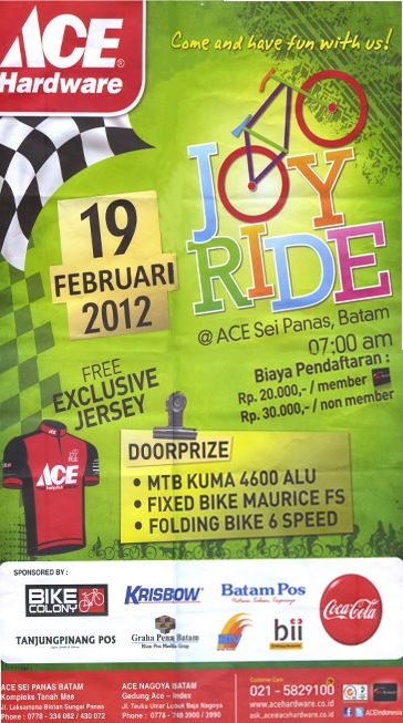 ACE, Bike Colony, BatamPos, BII, Cocacola, GrahaPena, TanjungPinang Pos dan Krisbow mengadakan acara 'JOY RIDE' pada tanggal 19 Pebruari 2011. Semua orang dapat mendaftar di ACE Sei Panas, Batam. Pada acara ini juga disediakan Free Exclusive Jersey. Bagi yang berminat, biaya pendaftaran adalah Rp. 20.000,- untuk member dan Rp. 30.000,- untuk non member. |