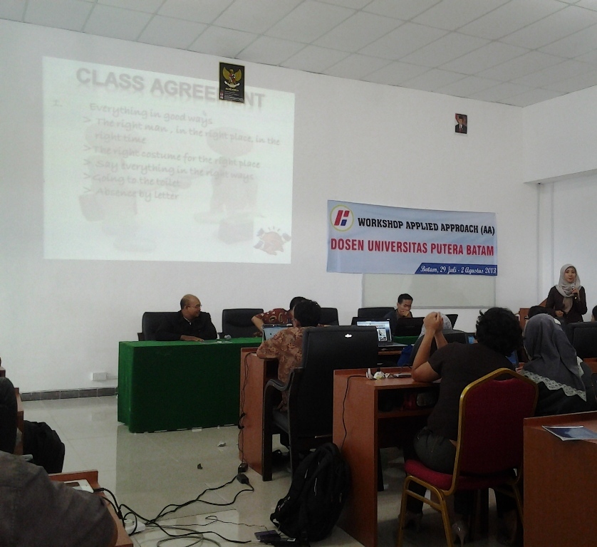 Rektor Universitas Putera Batam ibu Nur Elfi Husda S.Kom M.SI mengatakan: "Workshop Applied Approach ini diadakan untuk memberikan penguatan mutu dosen Universitas Putera Batam, sehingga kompetensi dosen dapat ditingkatkan, yang pada akhirnya dapat menghasilkan prestasi yang baik bagi Universitas Putera Batam" menjadi kalimat pembuka pada Kegiatan yang bertajuk Workshop Applied Approach yang diadakan dari tanggal 29 Juli – 2 Agustus 2013, yang bertempat di kampus Universitas Putera Batam, Tembesi. Kegiatan ini turut dihadiri oleh Dosen-Dosen Universitas Putera Batam dan pembicaranya adalah bapak Hendi Sama, S. Kom, MM., Angel Purwanti, S.Sos, M. I.Kom., Drs. Zakrimal, M. SI., Realize, S. Kom, M. SI., Amrizal, S. Kom, M. SI., Welly Sugianto, S.T, Kegiatan ini bertujuan untuk penguatan mutu proses belajar mengajar Dosen Universitas Putera Batam, seperti yang dikatakan Bapak Heri Nuryanto, S. Kom, M. SI., sebagai ketua panitia Workshop Applied Approach ini, “Kegiatan workshop ini menjadi suatu pembelajaran yang sangat penting bagi Dosen Universitas Putera Batam dalam penguatan mutu proses belajar-mengajar” yang sekaligus menutup kegiatan yang berlangsung selama lima hari itu. |