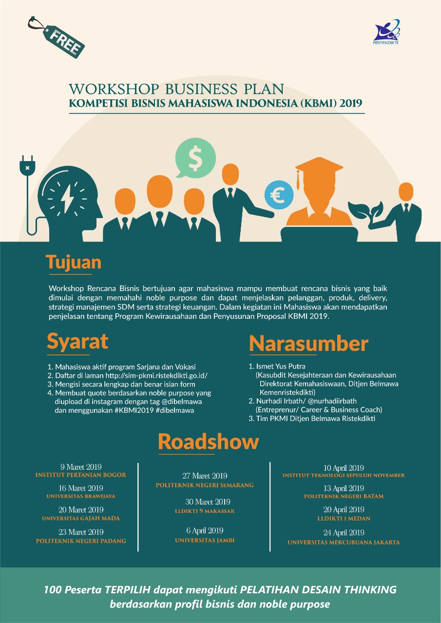 Kegiatan Workshop Business Plan (Rencana Bisnis) untuk mahasiswa di Perguruan Tinggi. Untuk acara wilayah Batam bertempat di Politeknik Negeri Batam tanggal 13 April 2019 pukul 09.00 s.d 16.00 WIB. Untuk pendaftaran melalui web sim-pkmi.ristekdikti.go.id paling lambat tanggal 10 April 2019. |
