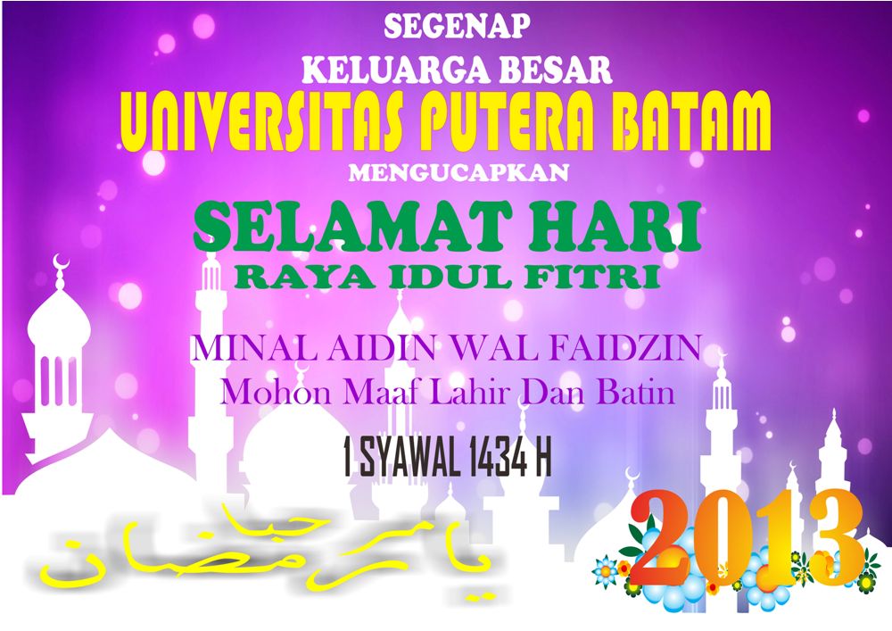 Sejalan dengan berlalunya Ramadhan tahun ini, kemenangan akan kita gapai menjadi insan yang bertaqwa. Kebaikan dan keberkahan selama bulan Ramadhan semoga mewarnai sebelas bulan yang akan datang. Kepedulian kepada fakir miskin dan anak yatim hendaknya dijaga dan dipelihara. Ramadhan yang penuh berkah, rahmat dan karunia akan selalu kita nanti-nantikan . Dengan kemenangan Ramadhan, kesalahan dan dosa dapat ampunan. Manusia kembali kepada kesuciaan, bersih dari segala dosa dan noda. Kesucian hati dan diri akan memberikan dorongan agar kita dapat bekerja dan berkarya lebih baik untuk kepentingan kemanusiaan dan peradaban dunia. Dalam kerendahan hati ada ketinggian budi. Dalam kemiskinan harta ada kekayaan jiwa. Dalam kesempatan hidup ada keluasan ilmu. Seiring beduk yang menggema, seruan takbir yang berkumandang, kami haturkan salam menyambut Hari Lebaran. Kami civitas akademika Kampus Putera Batam mengucapkan: SELAMAT HARI RAYA IDUL FITRI 1434 H, MOHON MAAF LAHIR DAN BATHIN. |