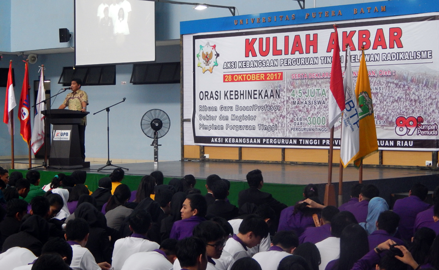 Mengingat Provinsi Kepri adalah kepulauan maka Aksi Kebangsan dibagi menjadi empat titik. Sejak pagi Ribuan mahasiswa yang tergabung di Titik B Aksi Kebangsaan Propinsi Kepri, menyesaki Aula Gedung W Universitas Putera Batam. Mereka yang berada Titik B adalah Universitas Putera Batam, STIKES Karimun Batam, Akbid Putera Jaya Mandiri, STIT Hidayatullah, Politeknik Pariwisata Batam dan Universitas Riau Kepulauan. Tujuan Aksi Kebangsaan serentak ini adalah untuk mempertegas sikap perguruan tinggi se-Indonesia bersama civitas akademika di masing-masing kampus untuk melawan radikalisme dan intoleransi, serta menjadi benteng bagi Pancasila, UUD 1945, Bhinneka Tunggal Ika dan Negara Kesatuan Republik Indonesia. Kegiatan ini juga menjadi cara mensosialisasikan secara lebih luas, di kalangan civitas akademika khususnya, dan pada masyarakat secara umum, mengenai isi Deklarasi Kebangsaan Perguruan Tinggi Melawan Radikalisme, untuk secara bersama diaktualisasikan secara nyata dan kongkrit dalam kehidupan bernegara, berbangsa dan sosial-kemasyarakatan dengan berlandaskan semangat Tri Dharma Perguruan Tinggi. Letkol Inf Dwi Sasongko, SE., Komandan Kodim (Dandim) 0316/ Batam mendapat giliran pertama menyampaikan materinya. Dengan penuh energik Dandim ini membuka dengan Yel-yel Salam Pancasila diikuti semua peserta yang semakin menggemuruhkan gedung Aula UPB. “Kalian lah “the real soldier…” kalian lah para mahasiswa sekarang yang harus menjadi benteng bagi NKRI…bagi Pancasila, UUD 1945 dan Bhinneka Tunggal Ika..”, tegas Letkol Dwi yang pernah bertugas di Lebanon sebagai Pasukan Penjaga Perdamaian. Pada sesi berikutnya Kepala Bin Daerah (Kabinda) Provinsi Kepri, Bapak Brigjen TNI Yulius Selvanus memaparkan bagaimana paham-paham radikal bisa berkembang dari berbagai Negara yang membuat Negara-negara tersebut gagal. Brigjen yang lama bertugas di Kopasus tersebut meminta kepada mahasiswa untuk terus mejaga Negara dari paham-paham yang ingin menggantikan Pancasila sebagai dasar Negara. Apa yang telah disampaikan pada dua pembicara awal kembali dipertegas oleh Rektor UPB, Dr. Nur Elfi Husda, S.Kom., M.SI. Dalam orasi ilmiahnya Dr. Nur menyoroti bagaimana kampus menjadi lingkungan yang “menjanjikan” bagi tumbuhnya paham-paham radikal. “Dalam banyak kasus, pengusung paham radikal membidik mahasiswa yang polos, yang secara psikologis masih dalam proses pencarian jati diri”, tambahnya. Menutup orasinya, Rektor UPB memberikan beberapa cara untuk mencegah pahan radikal tersebut diantaranya: menjaga persatuan dan kesatuan, mendukung aksi perdamaian, berperan aktif dalam melaporkan aktivitas radikalisme dan terorisme, meningkatkan pemahaman akan hidup dalam kebersamaan, menyaring informasi yang di dapat dari manapun, dan memperdalam wawasan kebangsaan. Orasi Kebhinekaan dan Ilmiah ditutup dengan Deklarasi dan penandatanganan Perguruan Tinggi Melawan Radikalisme oleh perwakilan Pimpinan Perguruan Tinggi dan perwakilan Mahasiswa. Acara Aksi Kebangsaan juga disemarakkan dengan berbagai atraksi kreatifitas mahasiswa untuk menggenjot semangat nasionalisme, diantaranya menyanyikan lagu-lagu nasional, parade Puisi Kebangsaan dan Aksi Teatrikal Bumi Pertiwi yang diperankan oleh mahasiswa Ilmu Hukum. (CES) |