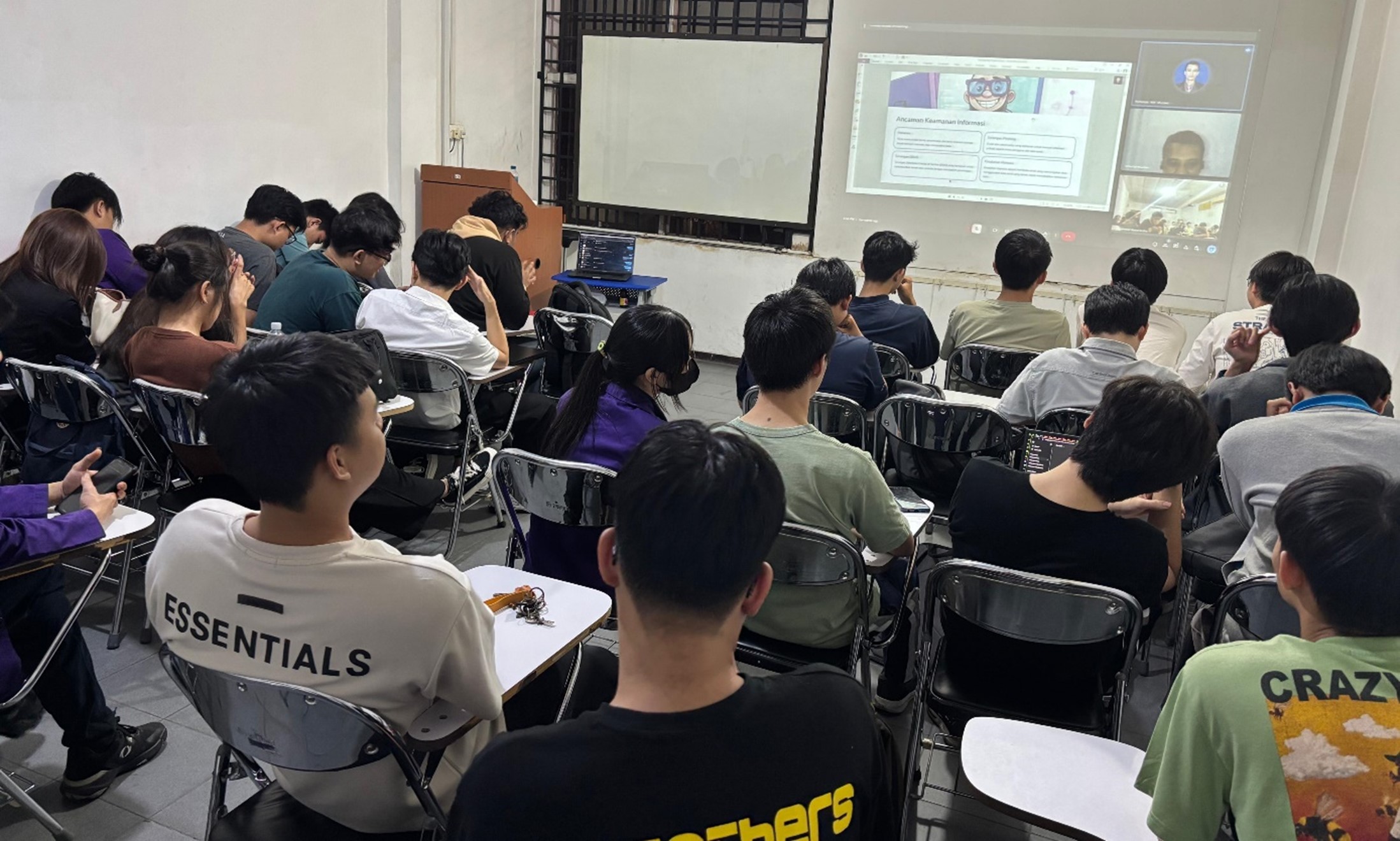 mahasiwa berada dikelas sedangkan dosen tamu menyampaikan melalui online. Adapun dosen
