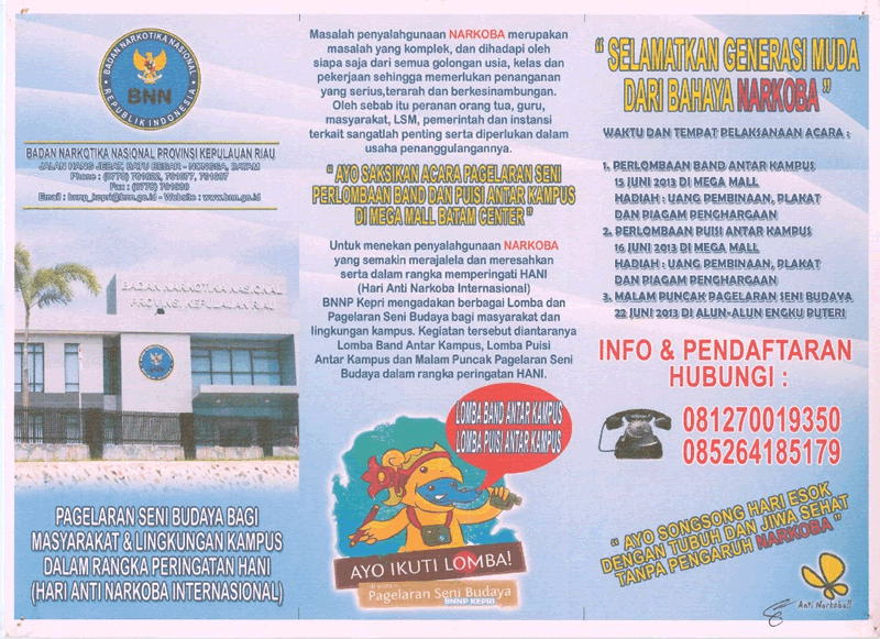 Masalah penggunaan Narkoba merupakan masalah yg komplek dan dihadapi oleh siapa saja dari semua golongan usia, kelas dan pekerjaan sehingga memerlukan penanganan yang serius, terarah dan berkesinambungan. Oleh sebab itu peranan orang tua, guru, masyarakat, LSM , pemerintah dan instansi terkait sangatlah penting serta diperlukan dalam usaha penanggulanganya. Untuk menekan jumlah NARKOBA yang merajalela dan meresahkan serta dalam rangka memperingati HANI (Hari Anti Narkoba Internasional ) BNNP Kepri mengadakan berbagai Lomba dan Pagelaran seni budaya bagi masyarakat dan lingkungan kampus. Kegiatan tersebut diantaranya Lomba Band Antar kampus, Lomba Puisi antar kampus, dan malam puncak pagelaran seni budaya dalam rangka peringati HANI. Waktu dan tempat pelaksanaan acara :