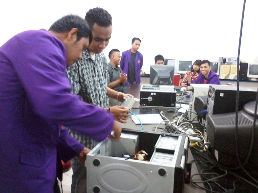 Sebagai mahasiswa rumpun Ilmu Komputer, tidak hanya dituntut wawasan ilmiah yang luas dari berbagai teori-teori informatika, namun juga dari sudut praktik dan aplikasinya dalam menerapkan teori tersebut. Bertempat di gedung W Universitas Putera Batam – Tembesi, Ruang Laboratorium Jaringan, sebanyak 50 peserta gelombang I mengikuti Pelatihan Perakitan dan Instalasi Komputer (1/11/2014). Target pelatihan yang digagas Prodi Teknik Informatika ini adalah peserta mampu merakit Komputer (PC) sampai pada proses instalasi sistem operasi. Oleh karena itu Kaprodi Teknik Informatika Ibu Realize, S.Kom., M.SI., menugaskan Bapak Cosmas Eko, S.Kom, Bapak Sunarsan, S.Kom, Bapak Hotma Pangaribuan, S.Kom., M.SI., dan Bapak Muhammad Rasyid Ridho, S.Kom., M.SI., untuk menjadi instruktur pelatihan ini. Pada sesi I peserta dibimbing langsung untuk mengenal sistem komputer; terutama hardware komputer; mulai dari piranti input, process, output dan storage. Banyak dari peserta yang mengajukan pertanyaan-pertanyaan seputar hardware, terutama bagaimana update teknologi-nya saat ini. Setelah puas mengenal dan mengeksplorasi hardware, peserta mulai dibimbing pada sesi II yaitu step-step melakukan perakitan komputer. Diawali dengan pengujian power supply (PSU), peserta dibimbing untuk melakukan pengetesan apakah PSU yang akan digunakan dalam keadaan baik atau rusak. Dilanjutkan dengan pemasangan Motherboard, Processor, RAM, HDD, Floppy Drive, dan semua peripheral sistem komputer. Langkah-langkah perakitan hardware ini ditutup dengan system setting (setup) sebagai jembatan untuk melakukan instalasi sistem operasi. Di sesi III, peserta melakukan instalasi sistem operasi. Wajah-wajah gembira peserta terlihat ketika mereka telah berhasil melakukan perakitan dan instalasi sistem operasi. Sebelum acara pelatihan ditutup, peserta memberikan usulan agar di lain waktu Prodi dapat memberikan pelatihan untuk perakitan notebook dan laptop. |