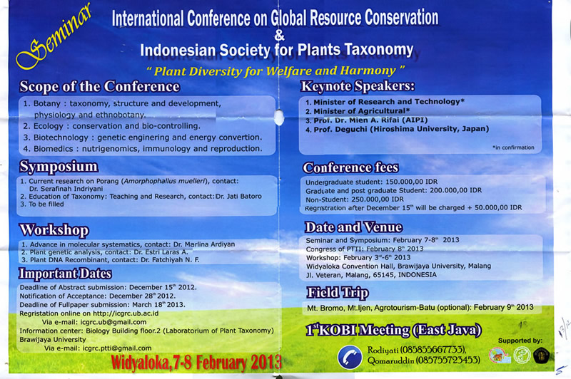 Seminar International Conference on Global Resource Conservation & Indonesian Society for Plants Taxonomy yang berjudul “Plant Diversity for Welfare and Harmony”. Seminar ini disponsori oleh Universitas Brawijaya. Workshop ini diadakan di Widyaloka Convention Hall, Universitas Brawijaya, Malang. Pembicara workshop ini antara lain Menteri Riset dan Teknologi, Menteri Pertanian, Prof. Dr. Mien A. Rifai, dan Prof. Degunchi. Untuk informasi lebih lengkap silahkan Contact Rodiyati dan Qomaruddin yang ada di gambar berikut. |