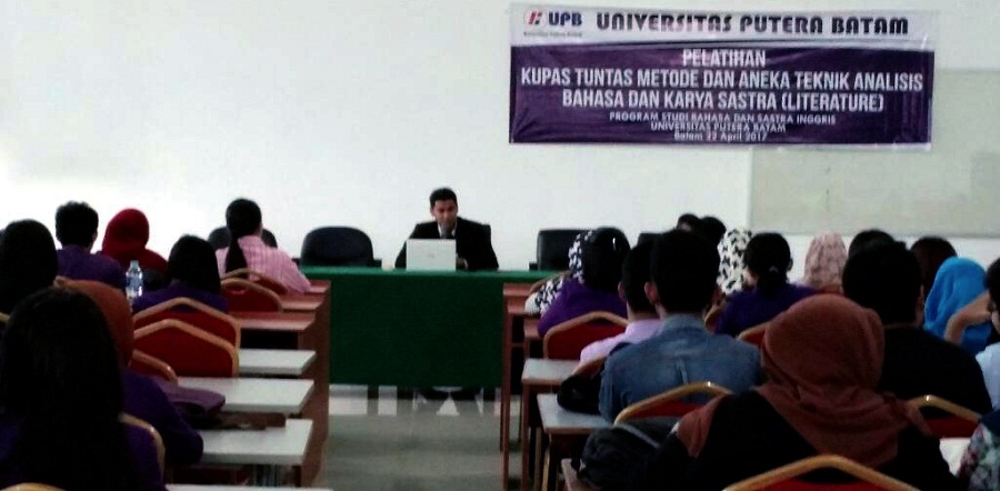 Universitas Putera Batam melalui Program Studi Bahasa dan Sastra Inggris mengadakan Pelatihan bertajuk “Kupas Tuntas Metode dan Aneka Teknik Analisis Bahasa dan Karya Sastra pada hari Sabtu, 22 April 2017 bertempat di Kampus Tembesi, Universitas Putera Batam, Aula Gedung Y-319, Pelatihan dimulai pukul 14:00 WIB dan dihadiri oleh 78 mahasiswa dan dosen Universitas Putera Batam. Pelatihan dibuka oleh ibu Melly Siska Suryani, S.S., M.Hum. yang bertindak sebagai moderator yang juga merupakan dosen Fakultas Bahasa dan Sastra Inggris Universitas Putera Batam. Pelatihan ini menghadirkan dua orang narasumber yakni bapak Emil Eka Putra, S.S., M.Hum., dan Suhardianto., S,Hum., M.Pd., Dosen Fakultas Bahasa dan Sastra Universitas Putera Batam. Pelatihan yang bertajuk “Kupas Tuntas Metode dan Aneka Teknik Analisis Bahasa dan Karya Sastra ini bertujuan untuk memberikan wawasan yang lebih mendalam bagi seluruh mahasiswa dan dosen sebagai pemerhati bahasa di dalam melakukan penelitian kebahasaan. Penelitian di bidang kebahasaan yang selama ini dilakukan oleh mahasiswa dan dosen dapat terus dikembangkan dan diperdalam sesuai dengan kaidah-kaidah penelitian bahasa yang dianggap memiliki ciri khas tersendiri dibandingkan dengan penelitian bidang ilmu-ilmu yang lain. Pembicara yang merupakan pengajar dalam bidang bahasa dan sastra seyogianya dapat meningkatkan motivasi yang lebih besar kepada mahasiswa, dosen maupun masyarakat yang berkecimpung dalam dunia kebahasaan untuk terus tanpa henti melakukan penelitian kebahasaan. Peserta terlihat antusias dengan banyaknya pertanyaan yang ditujukan kepada narasumber pada sesi diskusi. Pertanyaan peserta seputar proses ilmiah di dalam melakukan penelitian kebahasaan, mulai dari pencarian masalah, merumuskan masalah, menerapkan metode dan melakukan analisis terhadap data yang ditemukan sesuai dengan kaedah penelitian kebahasaan yang berlaku. (SHR) |