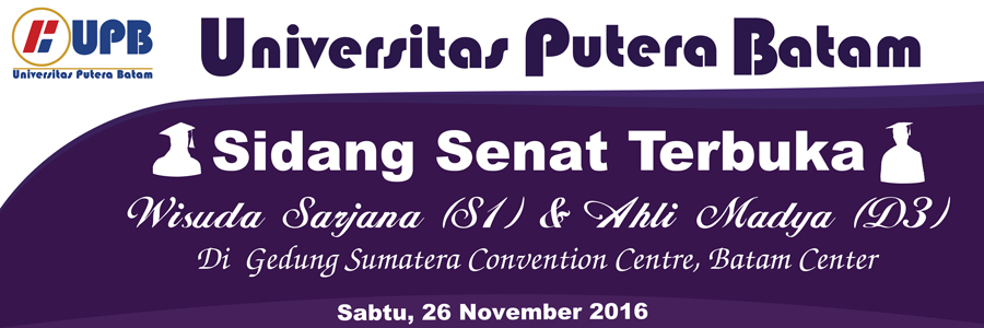Putera Batam mengucapkan selamat dan sukses kepada seluruh wisudawan Sarjana (S1) dan Ahli Mdya (D3) Univerasitas Putera Batam yang diadakan di Gedung Sumatera Convention Centre, Batam Center - Batam pada hari Sabtu, 26 November 2016. |