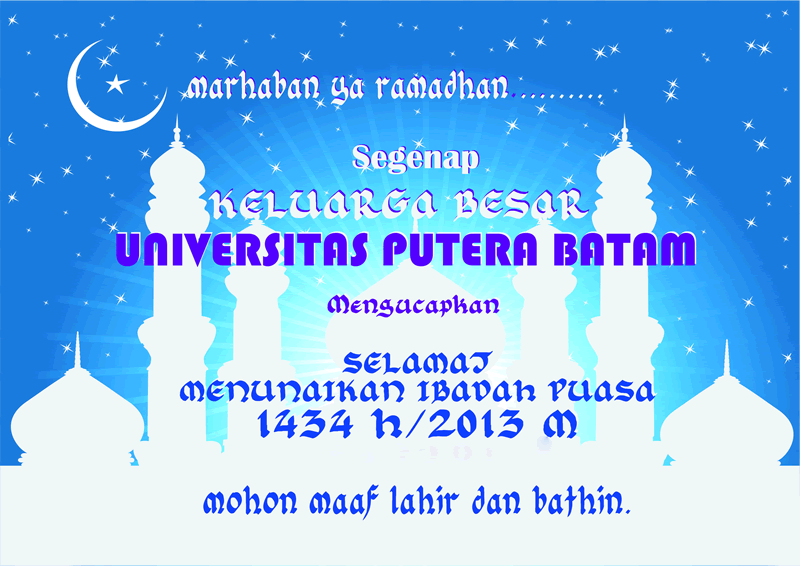 Marhaban ya ramadhan, telah terbuka gerbang Rajab terbentang jalan Sya’ban dan saatnya kita berada di hamparan taman Ramadhan selamat melangkah memasukinya, indahnya bulan yang penuh berkah mengantarkan kita untuk memberikan maaf kepada sesama, Bulan Ramadhan adalah bulan yang suci seperti embun yang membasahi dedaunan dikala pagi, embun sejuk yang akan membasuh dan membersihkan jiwa kita dari segala dosa. Kami segenap Keluarga besar Universitas Putera Batam Mengucapkan Selamat Menunaikan Ibadah Puasa Ramadhan 1434 Hijriyah/2013 Masehi, Mohon maaf lahir dan Bathin, bagi yang menjalankan nya semoga amal ibadah kita diterima Allah SWT dan semoga kita selalu di berkahi di bulan yang penuh maghfirah. |