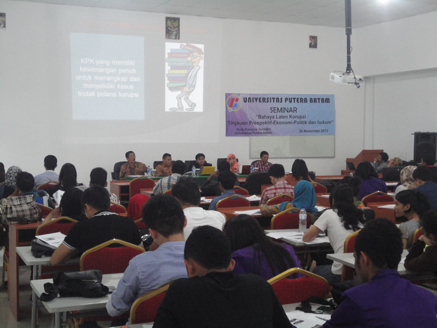 Program Studi Ilmu Administrasi Negara mengadakan Seminar Bahaya Laten Korupsi yang bertema “Bahaya Laten Korupsi: Tinjauan Perspektif Ekonomi-Politik Dan Hukum” yang diselengarakan pada hari Sabtu, 30 November 2013, di Kampus Tembesi Universitas Putera Batam. Narasumber yang direncanakan untuk menjadi pembicara dalam seminar ini adalah Timbul Dompak, S.E., M.Si (Dosen Program Studi Ilmu Administrasi Negara), Rizki Tri Anugerah Bhakti, S.H., M.H (Dosen Program Studi Ilmu Hukum) dan Jontro Simanjuntak, S.Pt., S.E., M.M. (Dosen Program Studi Ilmu Ekonomi) Tujuan penyelenggaraan seminar ini adalah memberikan pemahaman mengenai bahaya laten korupsi, memberikan pemahaman mengenai faktor-faktor penyebab korupsi dari perspektif ekonomi-politik dan hokum, dan menyajikan dialog dan pemikiran kritis tentang isu-isu aktual mengenai suburnya praktek korupsi di Indonesia. |