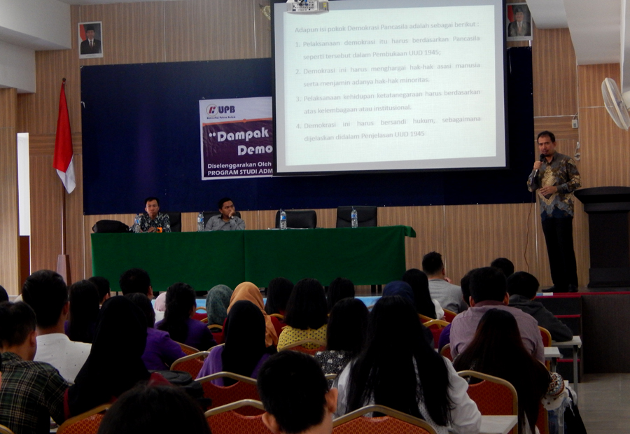 Program Studi Administrasi Negara Universitas Putera Batam pada hari Sabtu, 5 Agustus 2017 menyelenggarakan seminar bertajuk “Dampak Pilkada Serentak dalam Demokrasi di Indonesia. Kegiatan yang bertempat di Aula Gedung Y Universitas Putera Batam Tembesi tersebut, dimulai pukul 09.30 WIB dan dihadiri oleh 307 mahasiswa. Seminar ini bertujuan untuk memberikan pemahaman kepada para mahasiswa mengenai pemilihan kepala daerah yang dilakukan secara serentak, dampaknya dalam demokrasi serta situasi yang terjadi pada saat ini di Indonesia. Seminar ini menghadirkan 2 (dua) narasumber yaitu Dr. H. Razaki Persada, SE., M.Si. (Ketua Bawaslu Prov. Kepri) dan Riko Riyanda, S.IP., M.Si. sebagai Dosen Program Studi Administrasi Negara Universitas Putera Batam. Masing-masing narasumber diberikan waktu selama 30 menit untuk menyampaikan materinya. Setelah itu dilanjutkan pada sesi diskusi yang dipandu oleh Bobby Mandala Putra, S.IP., M.Si. sebagai moderator. Adapun materi yang dikaji meliputi tujuan dan maksud, tahapan-tahapan, syarat-syarat yang mesti dipenuhi sehingga menciptakan pilkada yang terbuka dan demokratis hingga hasil salah satu lembaga survei yakni Litbang Kompas terhadap dampak pilkada serentak di Indonesia. Seminar ini ditutup pada pukul 12.30 WIB oleh Nona Issandra, yang bertindak sebagai Master of Ceremony (MC) yang juga merupakan mahasiswi semester 6 Program Studi Administrasi Negara. (RKO) |