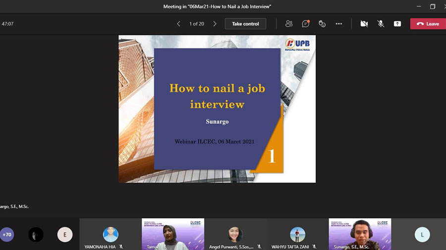ILCEC Universitas Putera Batam dan PT Orbit Nasional Edukasi sukses menyelenggarakan Seminar Lokal How to Nail a Job Interview Like a Prosecara online melalui Aplikasi Microsoft Teams pada tanggal 06 Maret 2021 dengan Narasumber dari Universitas Putera Batam oleh Bapak Sunargo, S.E., M.Sc dan Narasumber dari PT Orbit Nasional Edukasi oleh Ibu Nilla Arusyal Khofiqoeni. Kegiatan ini diikuti oleh 91 Mahasiswa. Diharapkan seminar ini dapat menambah ilmu pengetahuan mengenai tips dan trik menghadapi interview dan hal-hal yang harus disiapkan pada saat interview (RA). |