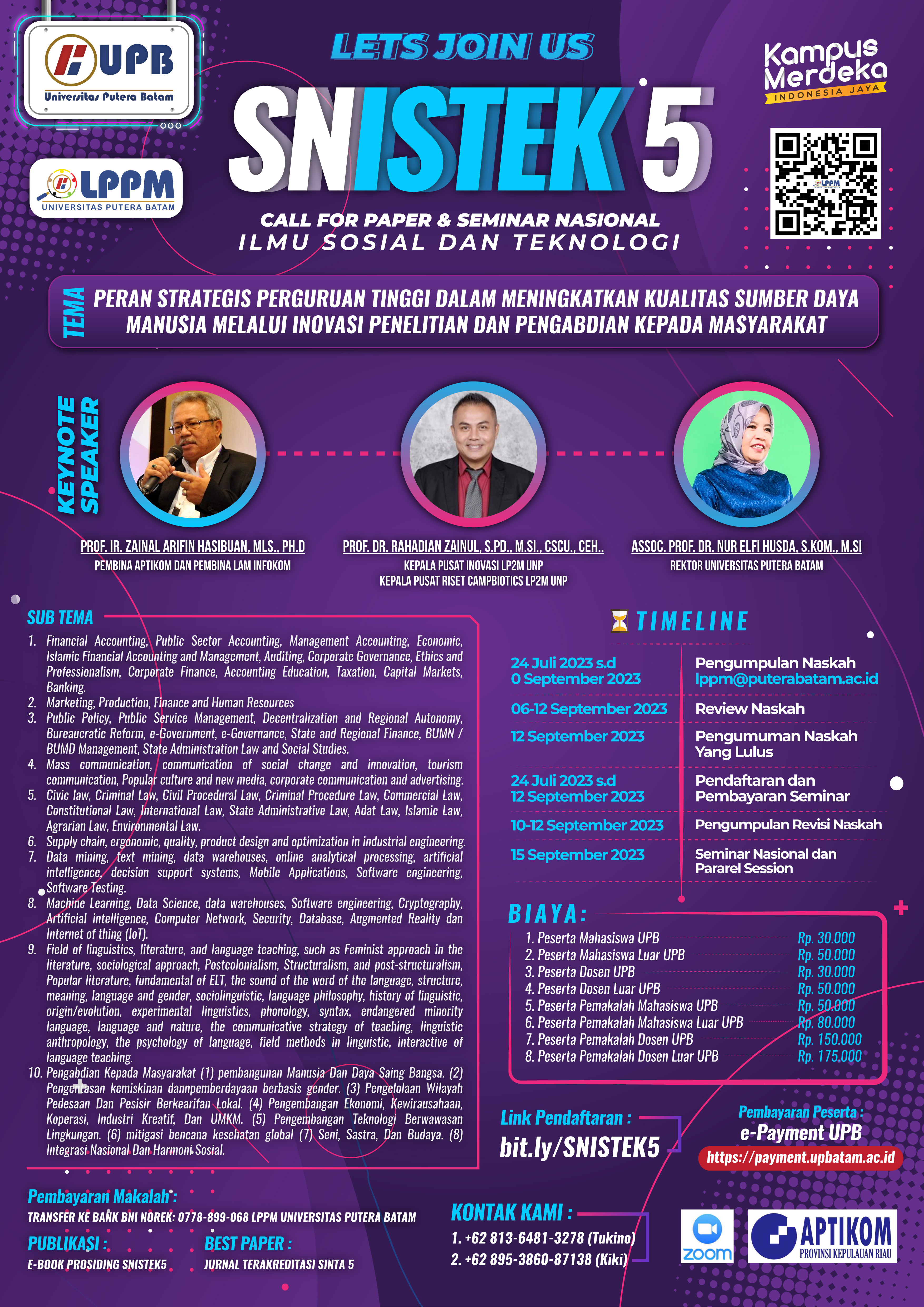 SEGERA DAFTAR!!! LPPM Universitas Putera Batam akan mengadakan kegiatan Call for Paper dan Seminar Nasional Ilmu Sosial dan Teknologi 5 (SNISTEK 5) Tahun 2023. Pelaksanaan SNISTEK ke-5 pada tahun 2023 menunjukkan perbedaan signifikan berbanding terbalik dengan empat acara sebelumnya. Pada kesempatan ini, SNISTEK ke-5 diselenggarakan secara virtual melalui platform Zoom Meeting. Pelaksanaan acara ini direncanakan berlangsung di lingkungan Universitas Putera Batam pada hari Jumat, tanggal 15 September 2023, dengan waktu dimulai pukul 09.00 WIB hingga selesai. Tema yang diangkat adalah "Peran Strategis Perguruan Tinggi dalam Meningkatkan Kualitas Sumber Daya Manusia melalui Inovasi Penelitian dan Pengabdian kepada Masyarakat". Yang paling menarik dari kegiatan ini akan dihadiri oleh keynote speaker yang merupakan orang-orang yang sangat berpengalaman di bidangnya, yaitu: Bapak Prof. Zainal A. Hasibuan, Ph.D. (Pembina APTIKOM Pusat dan Pembina LAM INFOKOM), Bapak Prof. Dr. Rahadian Zainul, S.Pd., M.Si., CSCU., CEH. (Kepala Pusat Riset CAMPBIOTICS & Kepala Pusat Inovasi LP2M UNP) dan Ibu Assoc. Prof. Dr. Nur Elfi Husda, S.Kom., M.SI. (Rektor Universitas Putera Batam). Pada Tahun 2023 ini SNISTEK 5, akan diadakan pada tanggal 15 September 2023 melalui Zoom Meeting, dimulai pada pukul 09.00 wib - selesai. Keynote Speaker dari kegiatan ini nantinya adalah Bapak Prof. Zainal A. Hasibuan, Ph.D. dari APTIKOM & LAM INFOKOM, Bapak Prof. Dr. Rahadian Zainul, S.Pd., M.Si., CSCU., CEH. (Kepala Pusat Riset CAMPBIOTICS & Kepala Pusat Inovasi LP2M UNP), dan Ibu Assoc. Prof. Dr. Nur Elfi Husda, S.Kom., M.SI. dari Universitas Putera Batam. Pendaftaran PESERTA MAHASISWA melalui: https://payment.upbatam.ac.id/mhs/ Pendaftaran PESERTA UMUM (Dosen UPB) melalui: https://payment.upbatam.ac.id/umum/ Pendaftaran PEMAKALAH melalui: https://bit.ly/SNISTEK5 Download Template Artikel Prosiding SNISTEK-5 melalui: https://bit.ly/TemplateArtikelSNISTEK5 |