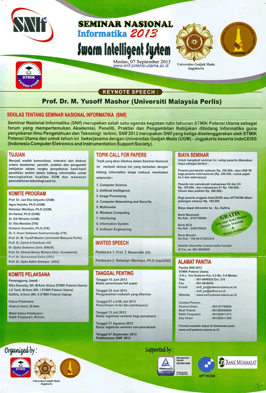 Seminar Nasional Informatika (SNIf) merupakan salah satu agenda kegiatan rutin tahunan STMIK Potensi Utama sebagai forum yang mempertemukan, Akademisi, Peneliti, Praktisi dan Pengambilan kebijakan dibidang Informatika guna penyebaran ilmu pengetahuan dan teknologi terkini. SNIf 2013 merupakan SNIf yang ketiga yang diselenggarakan oleh STMIK Potensi Utama dan untuk tahun ini bekerjasama dengan Universitas Gadjah Mada (UGM) – Jogjakarta beserta IndoCEISS (Indonesia Computer Electronics and Instrumentations Support Society). Tujuan diadakan seminar ini untuk menjadi wadah komunikasi, interaksi dan diskusi, antara akademisi, praktisi dan pengambil kebijakan dalam rangka penyebaran hasil – hasil penelitian terkini dalam bidang informatika untuk meningkatkan kualitas SDM dan wawasan pemutakhiran teknologi saat ini. Topik yang akan dibahas dalam Seminar Nasional ini meliputi semua hal yang berkaitan dengan bidang Informatika tanpa maksud membatasi antara lain :