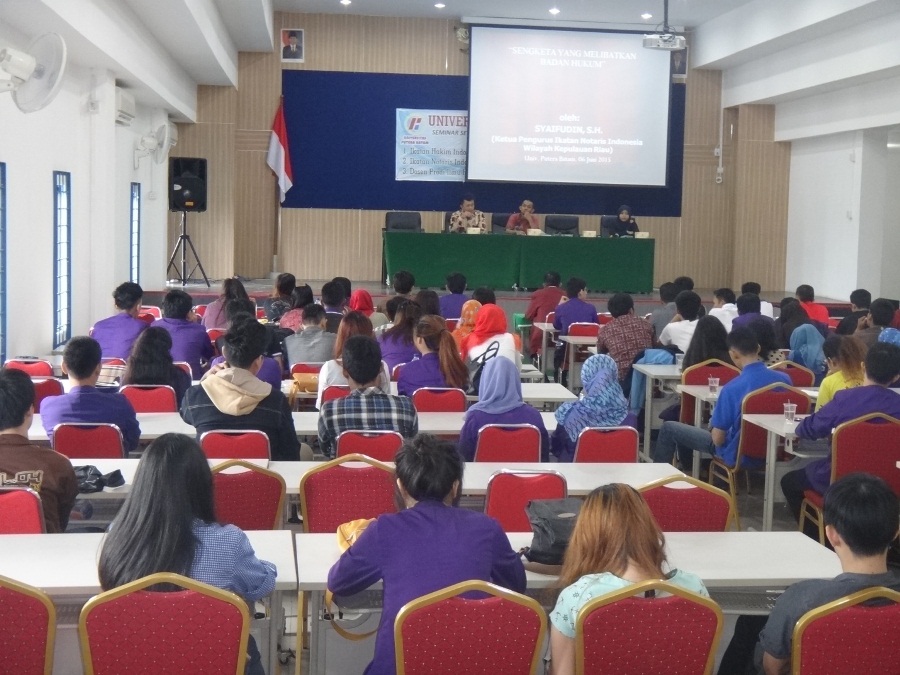Setiap sengketa adalah konflik, tetapi tidak semua konlik dapat dikategorikan sebagai sengketa (dispute). Konflik berarti adanya oposisi atau pertentangan antara orang-orang, kelompok-kelompok, atau organisasi-organisasi terhadap satu objek permasalahan. Permasalahan yang disengketakan dalam suatu sengekta dapat menyangkut banyak hal. Menyangkut substansi sengketa, beberapa pakar mencoba untuk memisahkan antara sengketa hukum (legal dispute) dengan sengketa politik (political dispute). Sengketa bukan hanya terjadi antara individu-individu, kelompok-kelompok, namun juga melibatkan badan hukum yang mempunyai hubungan atau kepentingan yang sama atas suatu objek kepemilikan, yang menimbulkan akibat hukum antara satu dengan yang lain. Sebagaimana diketahui bahwa suatu sengketa tentu subjeknya tidak hanya satu, namun lebih dari satu, baik antar individu, kelompok, organisasi bahkan lembaga besar berbadan hukum sekalipun. Objek dari suatu sengketa sendiri cukup beragam. Misalnya hak milik bangunan, tanah, uang, dsb. Mengingat penyelesaian sengketa berkaitan dengan keadilan, dimana pihak-pihak yang terlibat didalamnya bukan saja individu melainkan juga badan hukum, maka Program Studi Ilmu Hukum mengadakan seminar dengan mengangkat tema “Sengketa Yang Melibatkan Badan Hukum”. Adapun pelaksanaan dari seminar ini adalah tanggal 6 Juni 2015 pukul 14.00 WIB di aula gedung M Universitas Putera Batam, dengan narasumber dari kalangan praktisi dan akademisi yaitu Ikatan Notaris Indonesia Provinsi Kepulauan Riau yang diwakili oleh Syaifudin, S.H. serta dosen Program Studi Ilmu Hukum Universitas Putera Batam diwakili oleh Agus Riyanto, S.H., M.Kn. dan dihadiri oleh mahasiswa Universitas Putera Batam dari berbagai program studi. Dengan adanya seminar ini maka diharapkan mahasiswa dapat lebih memahami penyebab sengketa hingga bagaimana agar sengketa tersebut dapat terselesaikan dengan tetap memegang teguh prinsip keadilan. |