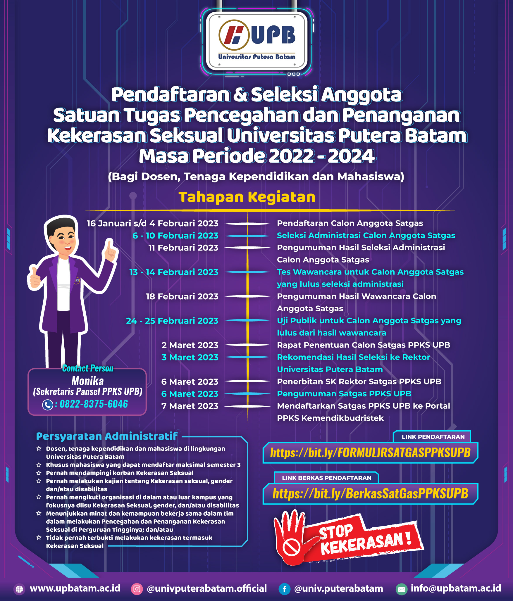 kandidat Calon Anggota Satgas PPKS UPB dapat dilakukan dengan mengisi formulir di laman https://bit.ly/FORMULIRSATGASPPKSUPB. Segera daftarkan diri anda dan siap bergabung menjadi anggota Satgas