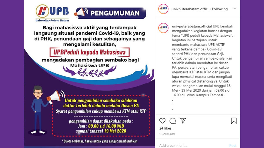 Bantuan social ini diberikan dalam bentuk paket sembako, dengan bantuan social ini Universitas Putera Batam berharap mahasiswa dapat terbantu dalam memenuhi kebutuhan pangan meskipun masih menghadapi masa darurat pandemi Covid-19. Universitas Putera Batam mengimbau kepada mahasiswa prosedur untuk pengambilan sembako adalah melakukan pendaftaran ke Dosen pembimbing akademik, kemudian pengambilan sembako bias dilakukan atas izin Dosen pembimbing akademik ke kampus Tembesi dengan membawa Kartu Tanda Pengenal (KTP) dan Kartu Tanda Mahasiswa (KTM) yang